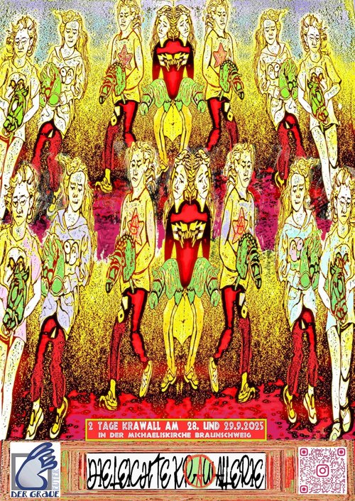Zum Auftakt der Ausstellung mit den obengenannten Steckenpferden und den kunstvollen Druckgrafiken von Monika Aumann mit Hobbyhorserinnen und Luftgitarrenspielerinnen gab es ein Feldlager und das Eröffnungskonzert “Die Leichte Krawallerie” in Anlehnung an die Ouvertüre von Franz von Suppé. (Booklet mit dem Liedprogramm und Texten liegt aus) Warum nun dieser Titel? Nun, das überaus heftige Krawallmachen bekam Thomas Müntzer und den Seinen schlecht. Ein wenig foltern und dann Rübe ab….